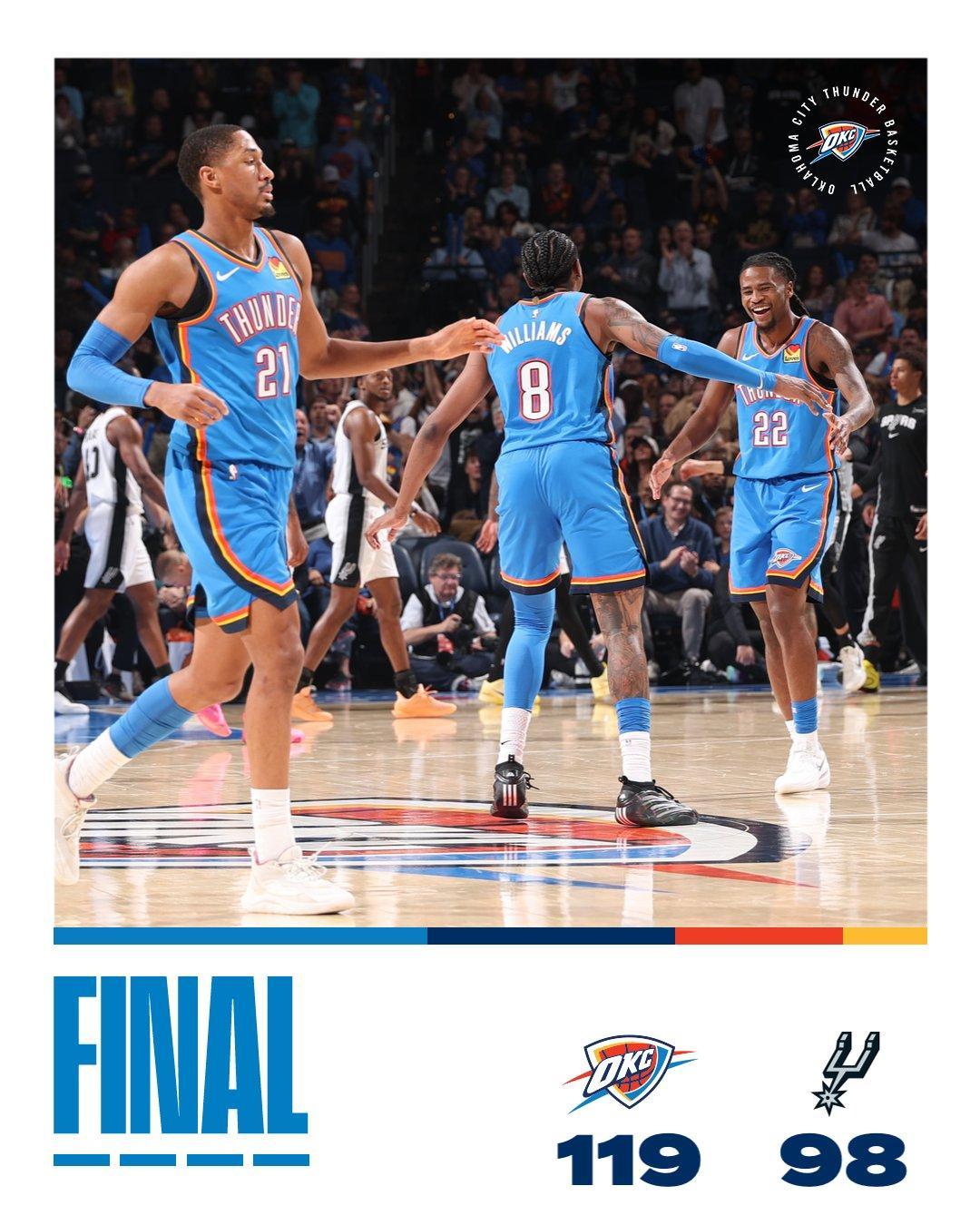 米切尔2罚全中,凯尔登约翰逊被封盖,亚历山大连续单打不进,杰林威廉姆斯2罚1中,尚帕尼2罚不中。科内特暴扣,福克斯外线打铁,亚历山大2罚全中,卡斯尔被封盖。亚历山大单打不中,华莱士抢断,戴格诺特请求暂停。卡鲁索跳投得分,亚历山大与卡斯尔互喷各自吃到技术犯规,尚帕尼与卡鲁索对射远投,马刺失误,卡鲁索上篮得手。尚帕尼继续外线发力,亚历山大2罚全中,哈珀进攻犯规。距离终场仅剩101秒,马刺落后18分,米奇约翰逊换下首发,选择提前弃子认负,比赛就此失去了悬念。最终,雷霆以119比98完胜马刺。